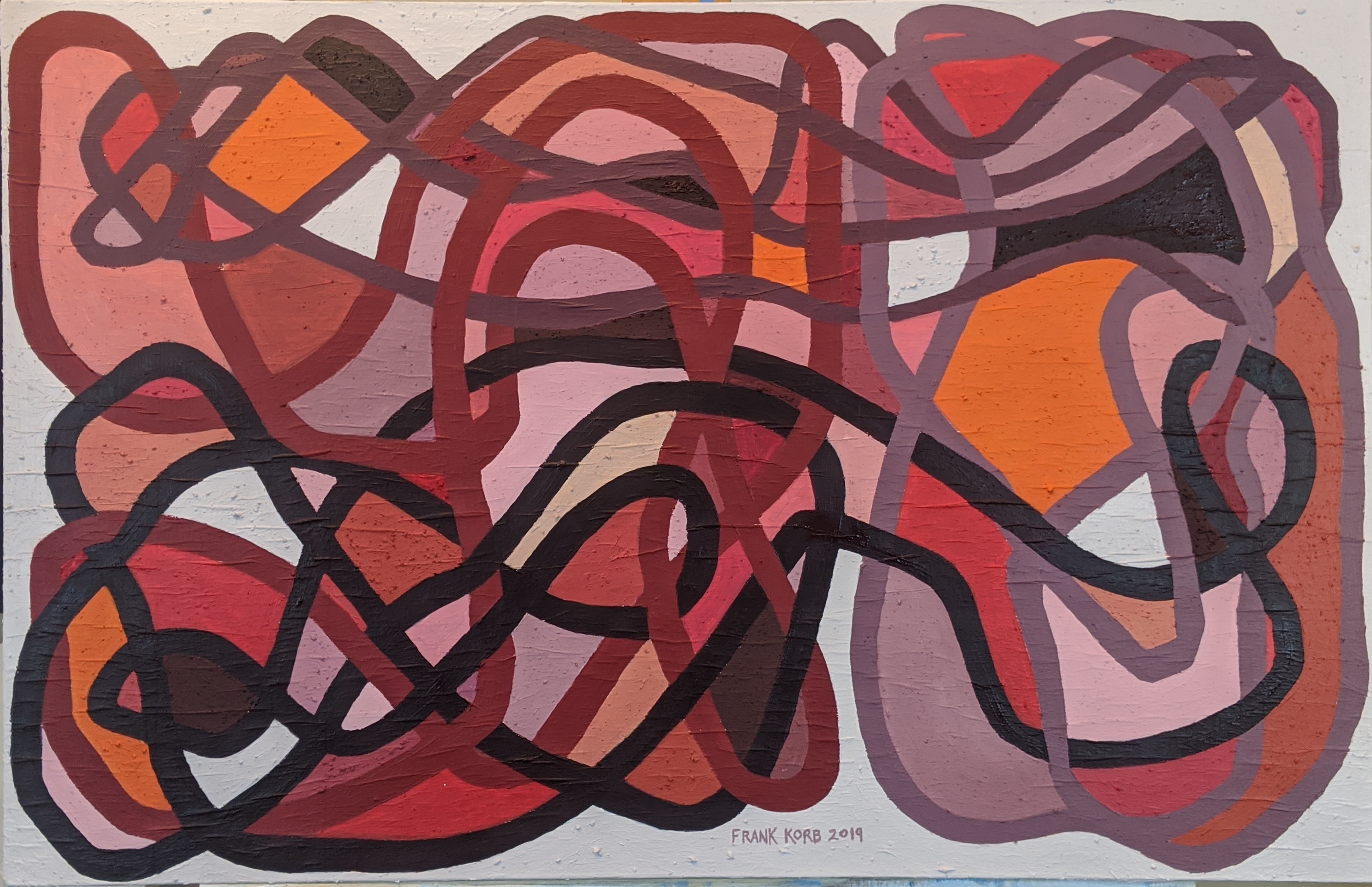First Place – Blue Moon Gallery “Seeing Red” Competition, 2021. “Ideas and Systems Were Offered,” Frank Korb, Acrylic and Collage on Canvas, 24.75″ x 38″, 2019. $1,130.