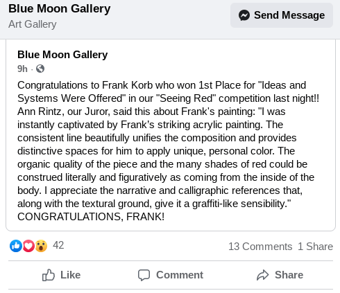 Well…. This came as a wonderful surprise. Thank you Anne Rintz and Kendra Kett for the honor and the opportunity. I’ve got a show coming up at the Blue Moon Gallery in April folks… so stay tuned. If you can get to the Blue Moon Gallery in Grayslake, IL to see the show please do. It’s ALL for sale too (I’m asking for the sale). Take care my friends.