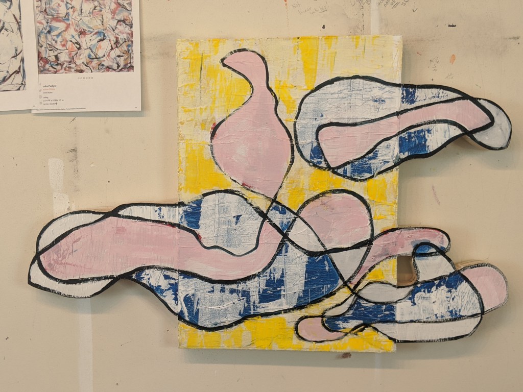 I’ve been working on a new idea in the my paintings, additional breaking of space. The edges of the picture plane can be limiting, and are usually a large part of the compositional choices I make in the work. This is a new break of the edges and movement into the space beyond the edges of traditional space. The shape of the ground has been changed as well and I am working on the edges of the picture plane as well.