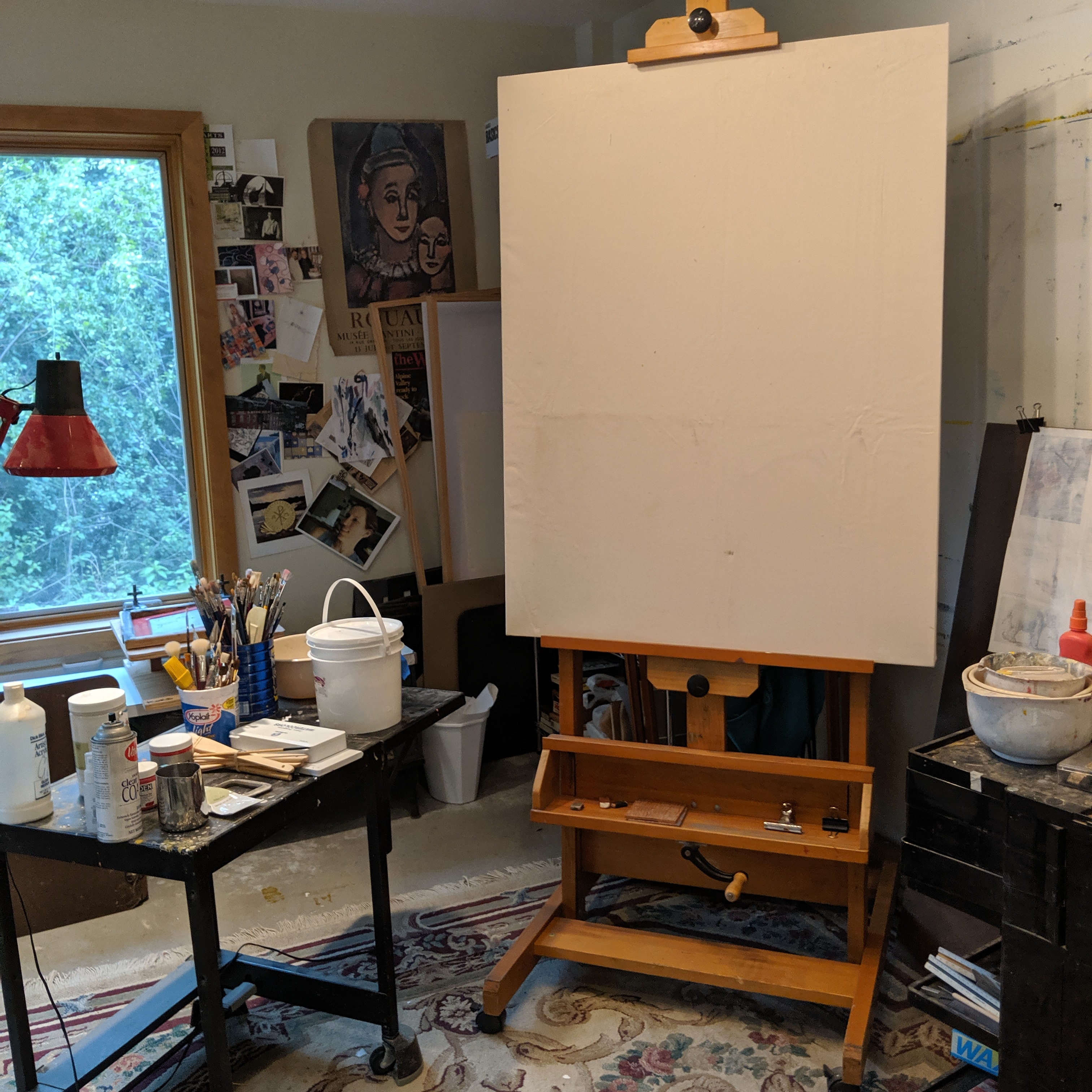 My shoulder has been operated on and recovery is happening. A big thanks to Julie for helping out and taking care of me. Here’s my first painting and my large canvas waiting in my studio.